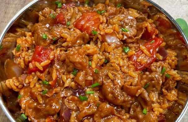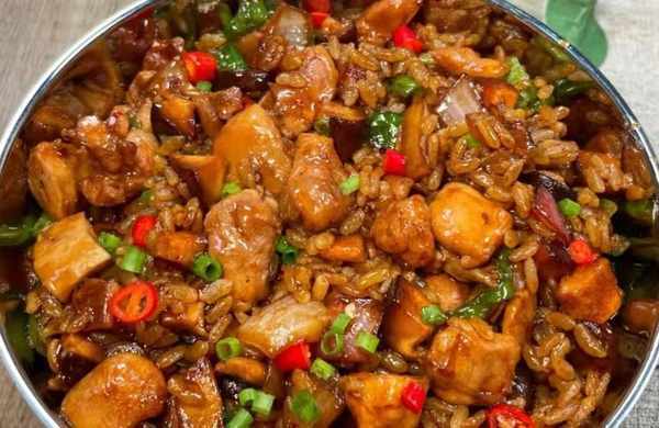(5)锅中留油,爆香葱花、蒜末,加入洋葱、香菇丁翻炒至软,再加入煮熟的米饭、鸡丁、备好的料汁搅拌均匀,调至中小火煮至汤汁浓稠即可。