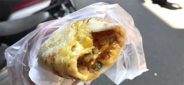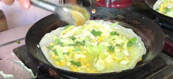 这样做出来的鸡蛋饼吃起来面皮有嚼劲,内里的鸡蛋细美有营养,蔬菜丝脆口还补充维生素。鸡蛋饼的馅料配菜有葱花段、白菜丝、包菜丝、玉米粒、枸杞叶等,都是比较爽口清凉的蔬菜,一个售卖3.5元钱,卷起来分量还是挺大的,有4指宽30厘米长。