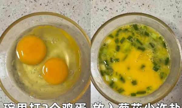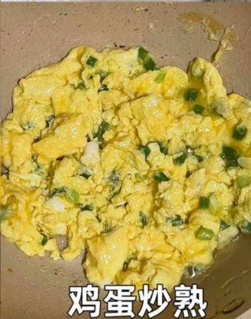 第二步:在碗里打几个自制的鸡蛋,用筷子搅打成蛋液,加入少许小葱,加少许水淀粉,加两滴白醋,加盐和鹅椒边炒边炒。特别蓬松,口感非常细腻。
