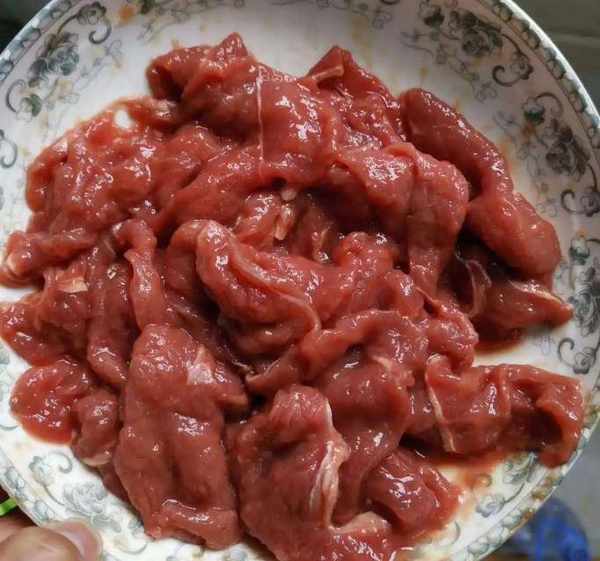 第三步:牛肉用冷水洗净,顺着纹路切成薄片(切记不要切得太厚,炸的时候越薄越嫩)