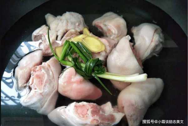第三步:将洗净的猪蹄放入沸腾的锅中,加入姜结、葱段,加入料酒,水多加,开火逼出血腥味,去掉猪身上的血沫层。猪蹄,取出猪蹄备用。