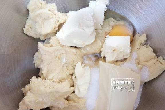 把种面团撕成小片放置搅拌桶里,加入鸡蛋、细砂糖、盐、及奶油奶酪、牛奶、高粉搅揉至出膜