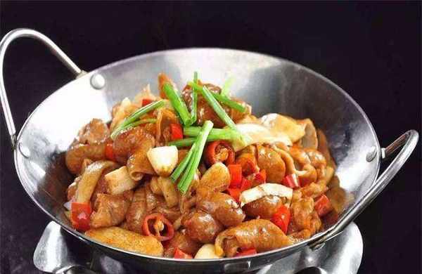肥肠锅。肥肠洗净,切块,加醋、盐,去油疙瘩,干辣椒切段,葱切段,姜切片。将洗净的香肠烧开,加入盐、姜片、料酒、八角、香叶、料酒,煮30分钟。锅内油70度热后,加入姜、蒜、干花椒、干辣椒、郫县西洋菜炒香。加入肥肠炒干水,加入生抽、糖、醋;加入土豆条和大葱。