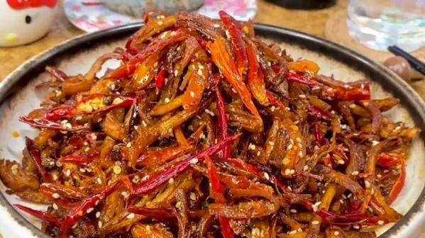 麻辣鸡丝,用嘴吃很多,麻辣鲜美的味道,越嚼越入味,而且这样炸出来的鸡丝不粘不腻,味道特别好.