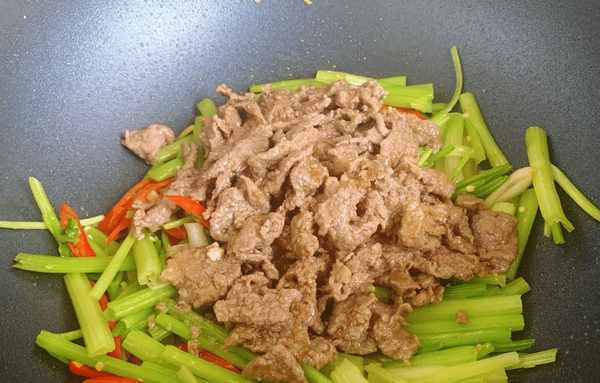 第六步:开中火,加入牛肉块,待牛肉和芹菜炒香后,加入小米椒爆香,加入生抽和蚝油,最后淋上香油,最后翻炒片刻。