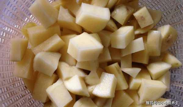 1:准备好各种蔬菜待用,小土豆清洗干净,用工具去掉土豆的外皮,反复清洗土豆,切成小方块待用。