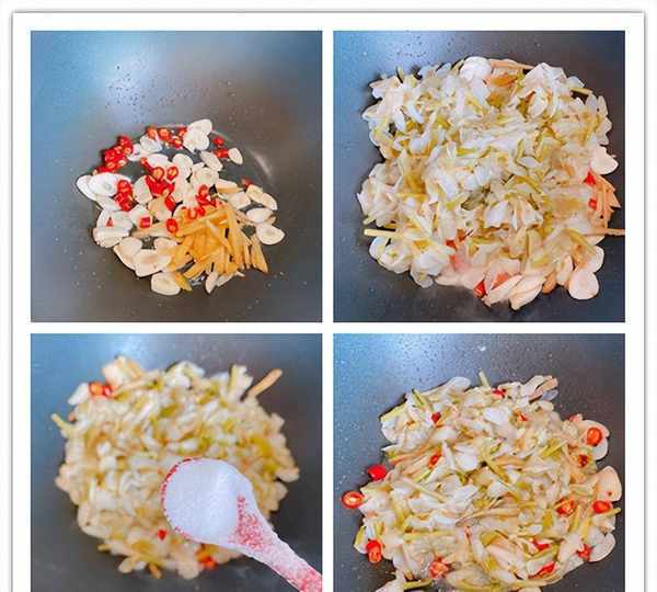 6、锅烧热,加入适量的食用油,油温5成热,下入配料,翻炒出香味,然后下入山栀子快速翻炒,翻炒到有些微微出水的状态,加少许食盐和鸡精调味,翻拌均匀就能出锅了,山栀子不用炒的时间太长,因为之前已经焯水过了;