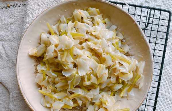 3、降温之后的山栀子还需要处理一下,要把山栀子中间的花蕊去掉,花蕊会带有点苦味,去掉之后口感更好,你可以先摘掉再焯水,也可以焯水之后再摘,一般在市面上买到的山栀子如果是已经焯好水的,那这个花蕊肯定是没有去掉的,回来之后多清洗几遍,去掉花蕊,这是烹饪山栀子的第二个重点;