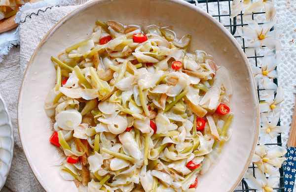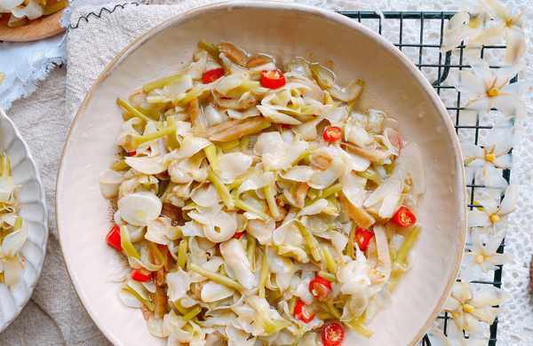 3、江南人最经典的山栀子的做法还有2种,一种是裹上鸡蛋液油炸,和云南的炸玫瑰很像,另外一种是清炒的时候加点梅干菜,梅干菜也是江南的经典名菜之一,翻炒出来的山栀子梅干菜别有一番风味;