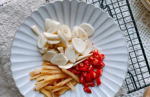 5、再准备一些配料,生姜去皮之后切成丝、大蒜切片、小米辣切成圈,不喜欢吃辣的可以不放辣椒;