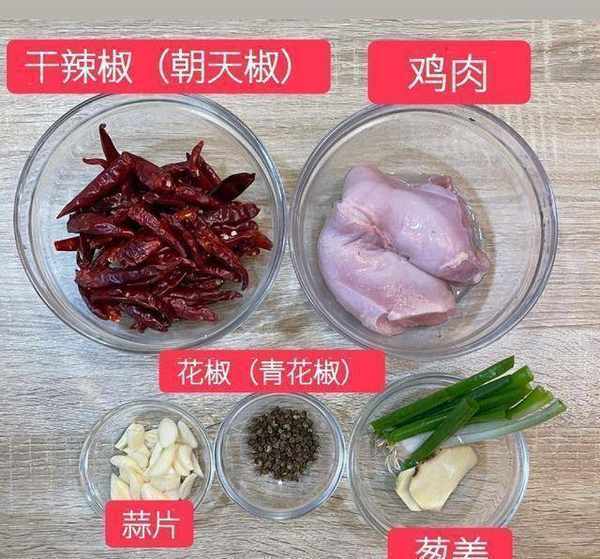 鸡肉200克、干辣椒50克、花椒5克、蒜头6瓣、白芝麻1.5汤匙、葱2粒、姜2片