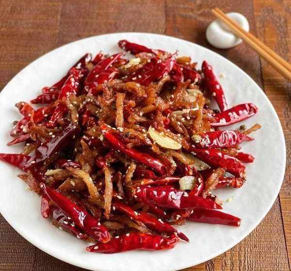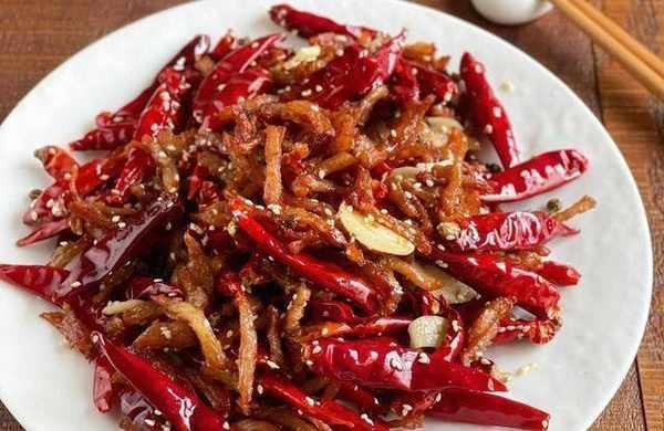 4、原锅不换,留少许底油爆香蒜片、花椒、干辣椒,下入炸好的鸡丝,加入调味料,翻炒均匀,撒上白芝麻,炒匀即可食用!