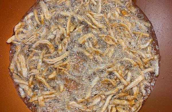 3、锅里放油烧热,中火将鸡丝炸至酥脆变硬上色,捞出备用。煎的过程中要时不时用锅铲戳一下,防止鸡丝粘在一起。