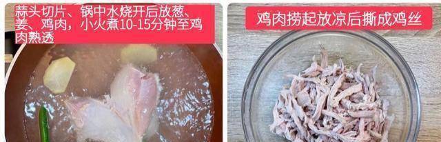 1、先将大蒜切片,烧一锅开水,加入葱片、姜片和鸡肉,小火煮10-15分钟,煮好后取出,晾凉,撕开将鸡肉切成丝。