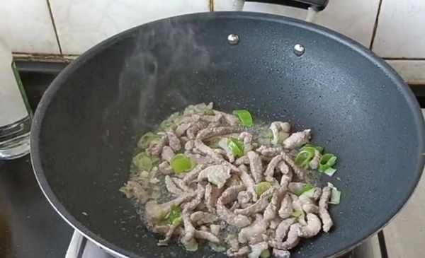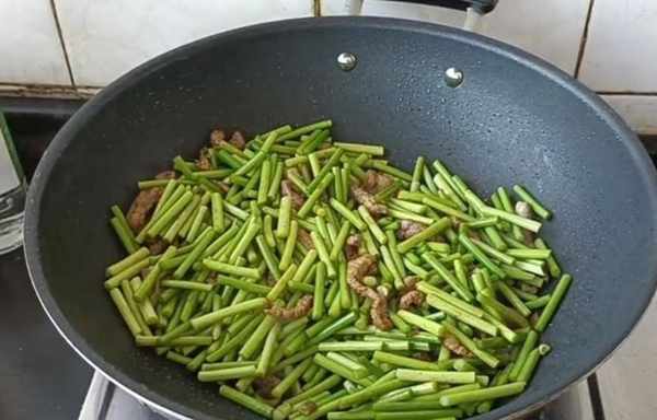有朋友到家里来吃饭,自然是要做点荤菜的。嫂子切了点新鲜肉丝,先把肉丝放到锅里炒熟,等到肉丝变颜色了就盛出来,再把洗好切成段的蒜苔倒进锅里翻炒,直到蒜苔熟了,再把肉丝放进去,一起翻炒均匀,接着放好所有的调料,再简单翻炒几下就行了,美味又简单。