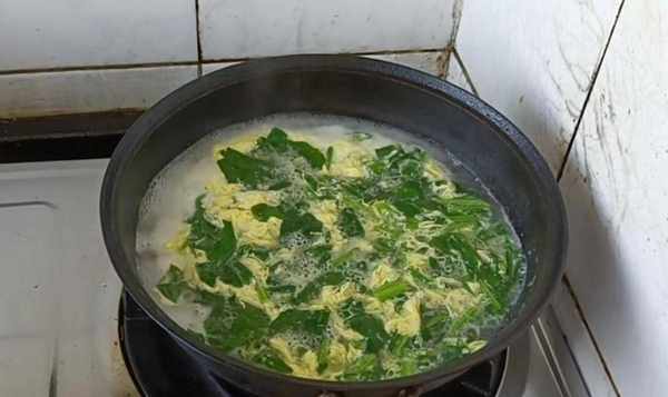 最后一道菜是菠菜鸡蛋汤,菠菜富含丰富的营养,多吃能补充铁元素。大嫂把菠菜洗干净切成段,等到水开以后,先把鸡蛋液淋进汤里,然后把菠菜也放进去一起煮,等到锅里的水再次沸腾,放点盐巴、鸡精等佐料就大功告成了。