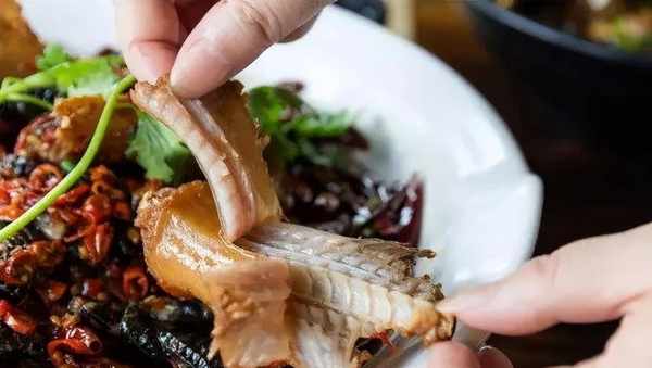 蛇段上裹满了鲜红的辣椒,在黄白色的辣椒籽点缀下让人额头冒满,口中生津。用手捏住蛇段两端,直接啃食,蛇肉紧致厚实,轻松脱骨但不酥烂,紧实的蛇肉在口中韧劲十足,香辣鲜浓,让人欲罢不能。