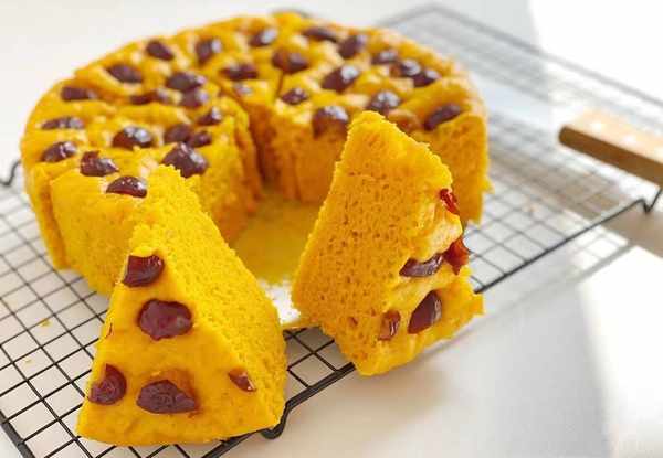 4、接着把模具放到蒸锅当中,点缀上红枣,开火把水烧开之后,继续蒸半个小时。可以看到蒸好的南瓜发糕非常的暄软,香甜可口,特别适合中老年人吃。