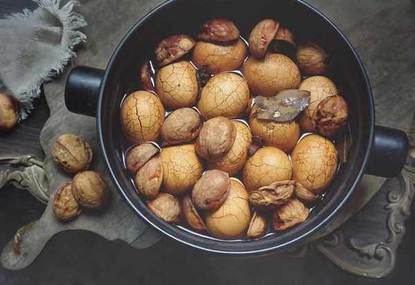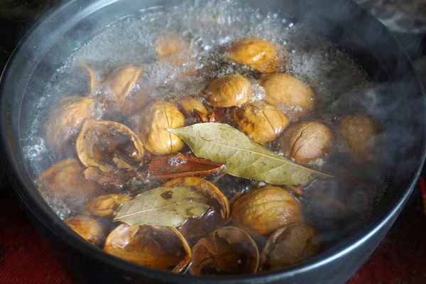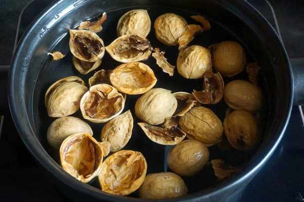 1、核桃是很有营养的食物,核桃皮也不例外,我们可以用核桃皮来煮鸡蛋,从而丰富营养。先准备一些核桃皮,用软刷清理干净。放到锅里浸泡一个小时左右,直到锅里的水呈现出核桃皮的颜色。