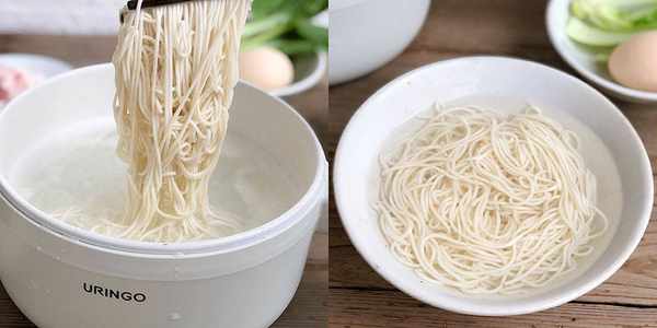 3、另外起锅,我们在锅里添上宽水,煮沸之后,把新鲜的面条放到里边,煮到断生后,捞入温水中浸泡待用。接着放一些青菜烫熟,捞出后也放冷水里过凉。