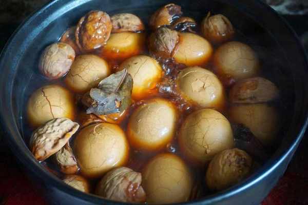 4、待锅内的汤汁变凉一些,我们把鸡蛋逐个磕出碎纹,重新放到汤汁中,浸泡两个小时以上,一方面使鸡蛋进一步入味,同时也融入更多的营养。