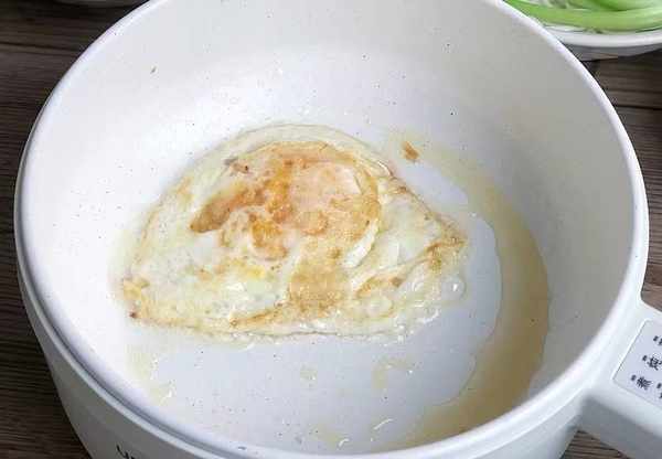1、首先来准备一个荷包蛋,烧热的锅里淋一点油,把鸡蛋打进去,中火煎熟。也可以做成水煮的。
