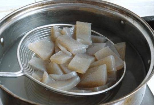 2:将魔芋豆腐全部切块,锅中加水烧开,将魔芋放入锅中煮3分钟,然后放凉浸泡魔芋,沥干水分备用