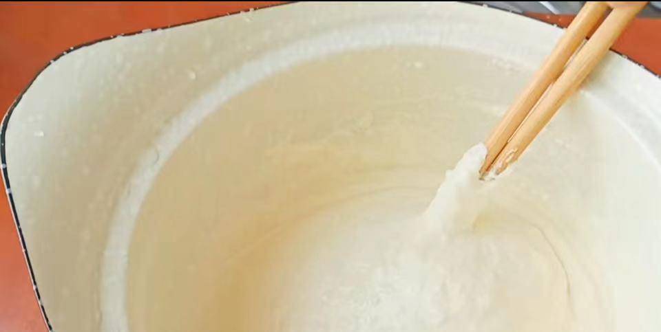 首先在大盆中加入300g面粉,然后往里面加面粉的筋性,分次倒入600g温水,一定要边倒边搅拌,一直搅成没有干面粉的稠面糊,最后像这样这样光滑细腻就可以了。