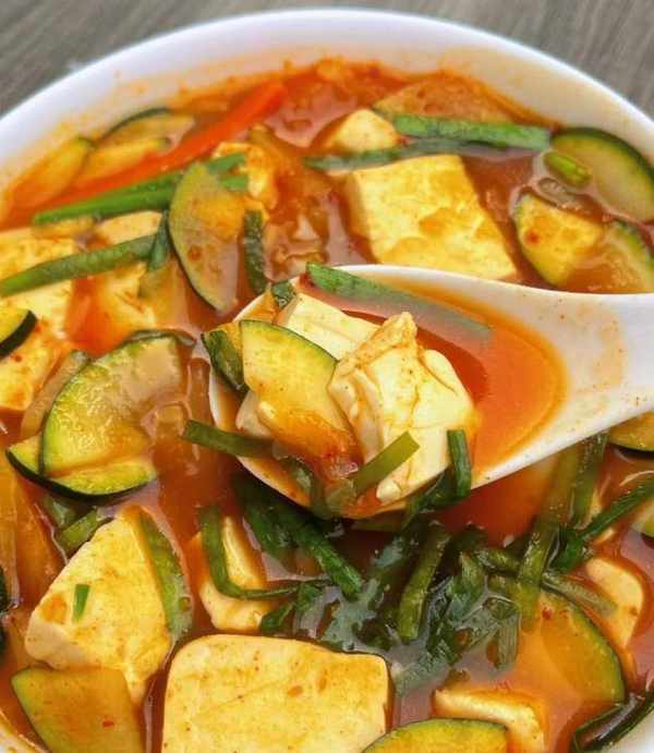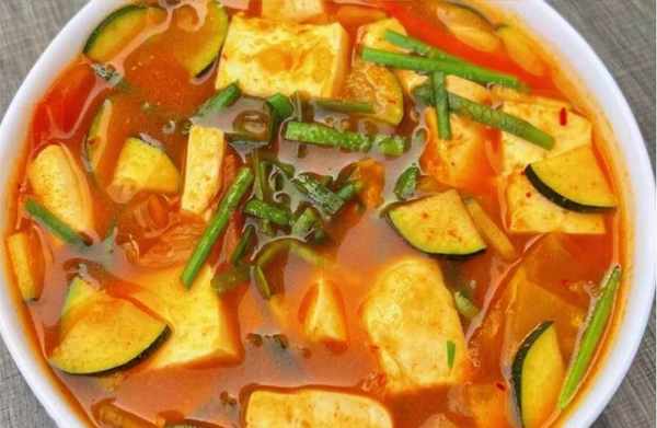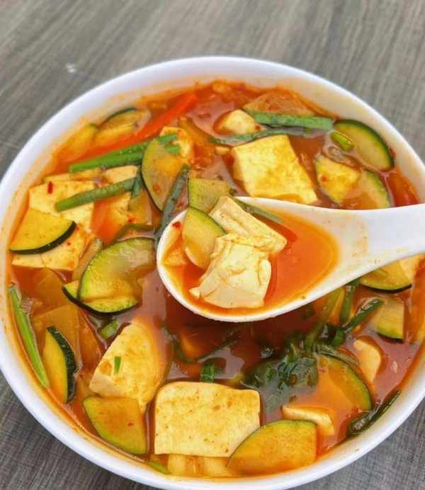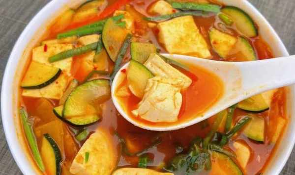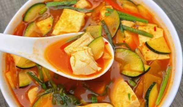酸汤西葫芦豆腐汤是一种便宜的素食汤。西葫芦含有丰富的维生素。豆腐的味道很淡。豆腐是一种富含蛋白质和钙的加工豆制品。汤味鲜美,食物更好消化吸收,天天喝不长胖。