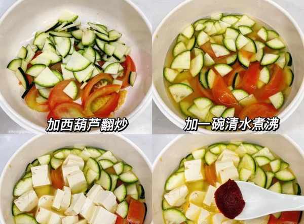 第四:将西葫芦片搅碎,加一碗水烧开,水开后加入嫩豆腐块继续煮片刻。