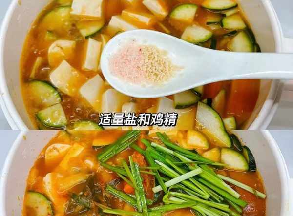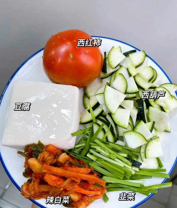 材料选择:买酸菜50克,西葫芦一个,嫩豆腐一块,红番茄一个,食用油少许,黄豆50克左右,水少许,韩国辣椒酱一勺,水少许,盐少许,鸡精少许,酱油少许,盐少许,蒜几瓣,香油几滴,水几碗,其他调料。