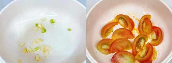第三:锅底加少许油,放入切碎的蒜和小葱,快速炒出蒜味,加入一些西红柿块,快速搅拌出西红柿汁。