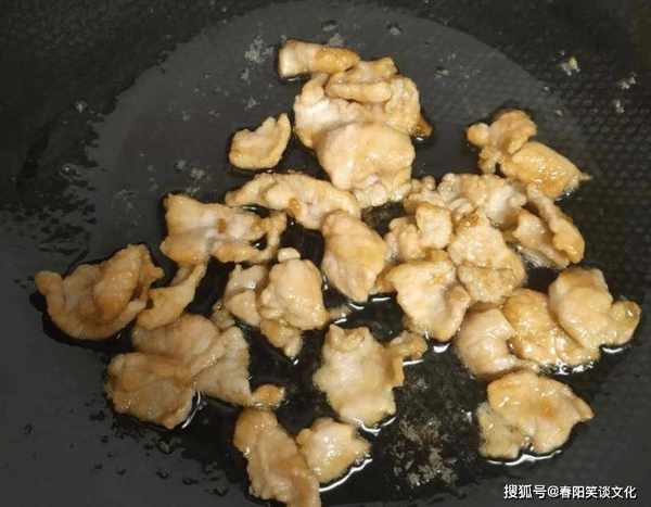 第四步:热锅冷油烧热,滑入腌好的肉片,让肉稍微变色,翻炒均匀,用半勺老抽上色,把肉片盛入碗中待用使用。
