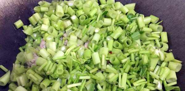 第六步:将空心菜的茎放入锅中,让空心菜吸收油脂,加入切碎的小米纸翻炒一会。