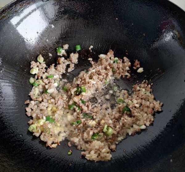 第五步:将腌制好的肉放入锅中,快速翻炒片刻,待肉变白后,加少许料酒,一勺生抽,姜蒜,快速翻炒均匀。