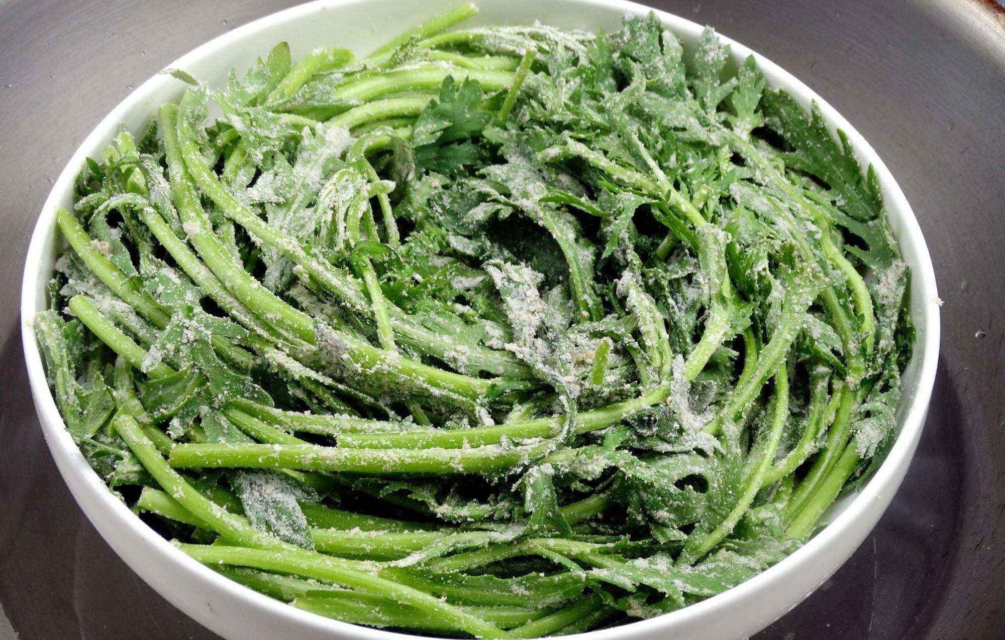 配料说明:选鲜菊花一小块(菊花叶子一定要鲜绿,鲜虾不能发黄,根茎不能太老,买好后要泡水,防止菊花枯萎),芝麻适量油、大蒜3粒、辣椒油少许、十三香少许、面粉少许、盐少许、小米椒少许、醋少许、白糖少许等。