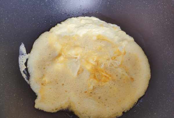 4:锅中再烧热油,加入适量蛋液,将蛋液煮至凝固,然后切成片摊开备用。