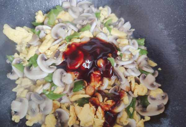 6:倒入炒鸡蛋,加盐和蚝油,半勺生抽,加鸡精和盐,稍微翻炒一下,出锅前搅拌均匀,全部收汁放在烤盘上.盘子。这青椒香菇炒蛋一出锅就没了。
