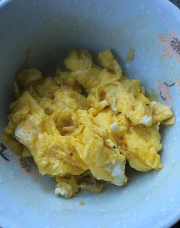 第四步:将虾皮放入蛋液中翻炒,使鸡蛋更新鲜,加入更多的食用油,将所有蛋液倒入锅中。