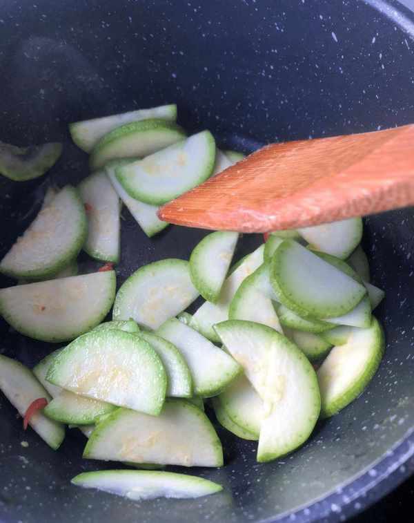 第六步:锅中加入少许食用油,加入少许小米椒和大蒜快速炒香,然后放入切好的西葫芦片快速炒匀。