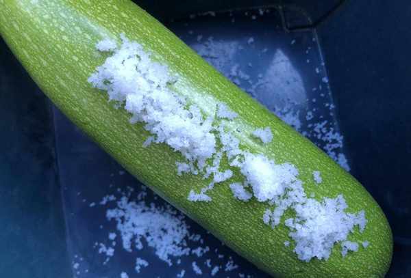 第一步:将几个小米椒切成细条,西葫芦切去两头,用盐擦洗西葫芦(西葫芦基本上是用农药处理过的,但是皮很多,如果觉得不放心,可以把西葫芦去掉西葫芦的皮)