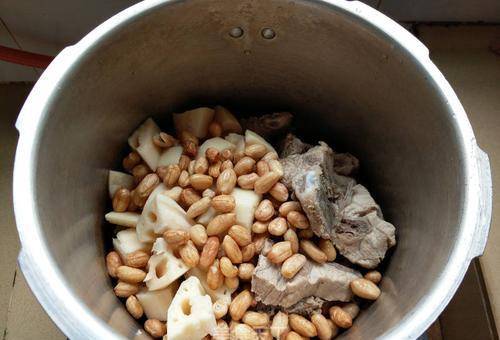 5:锅里放猪骨(如果想省时间,可以放高压锅里),加点莲藕和花生米,加几片姜,加几滴油加一勺料酒一汤匙,盖上锅盖放上高温,大火烧开后煮30分钟左右。