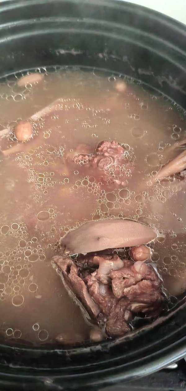 6:开小火继续熬汤。等莲藕煮烂,汤汁逐渐变红。饰以葱花,关火即可上桌。这道花生莲藕猪骨汤就可以吃了。