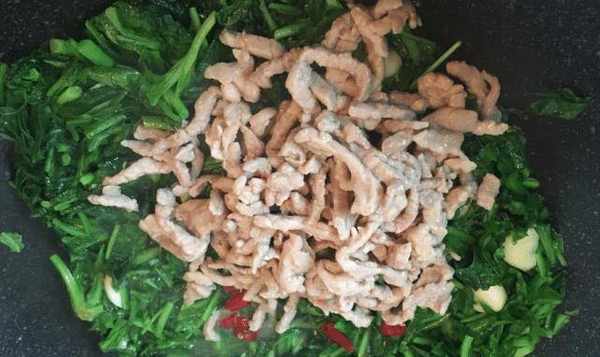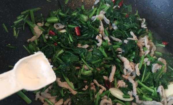 5:再加入蚝油、生抽和少许盐,撒上鸡精,待两者出味,肉丝有荠菜的香味,出锅即可食用。