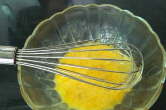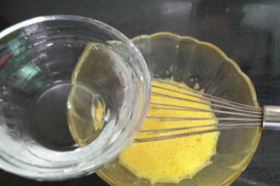 2、加入适量的凉开水(技巧1),这个很关键。不能加生水,是因为生水中有空气,蒸的时候水被烧沸,空气排出,鸡蛋羹就会出现蜂窝,影响卖相,甚至变老;如果是开水,会使鸡蛋液烫热,营养受损,甚至蒸不出鸡蛋羹,