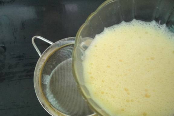 3、将鸡蛋液至少过滤2次,并用小勺子撇去泡沫(技巧2),这样可以保证蒸出的鸡蛋羹更加细滑软嫩。