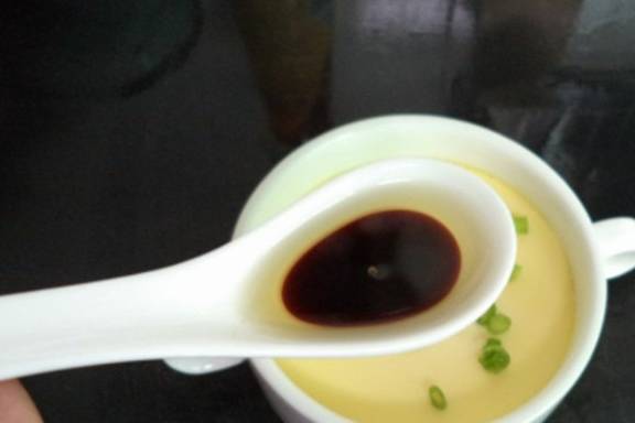 5、取出蒸好的鸡蛋羹,撒上备好的葱花,再淋上适量的香油和酱油,就可以开吃了。