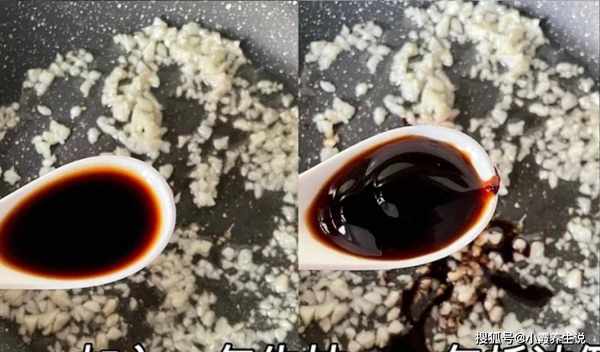 第四步:锅底调入少许色拉油,油温慢慢烧至温热,放入一些葱白和蒜末,大火炒出蒜末的香味。第五步:调入一勺生抽和半勺老抽,加上蚝油一勺提鲜,倒入一些蟹柳肉,迅速爆炒2分钟。