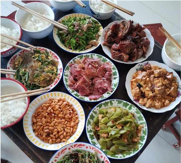 这位大姐住在陕西的乡下,平时自己在镇上教书,和老公是同事,家里有公公婆婆还有两个小孩,六口之家过着幸福快乐的日子。平日公婆会自己种一点小菜,帮忙照顾孩子,两夫妻一起下班,骑着摩托车就回到家,看到什么好吃的菜也会买回家打牙祭。这一天他们就买了三个菜,一个是公公爱吃的花生米,一个酱牛肉和一个香酥鸭。除此之外,婆婆已经备好了五个菜,加在一起的话就是八个菜,可以说是非常丰富的一顿晚餐了。