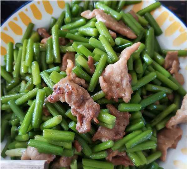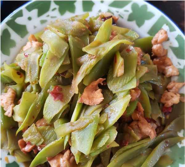下面是婆婆的手艺了,一个蒜薹炒肉,蒜薹很新鲜,炒得也很软烂,很多人喜欢炒清脆一点,但是老人家就喜欢这种偏软的口感。猪肉切成片一起炒,看起来比较柴,其实腌制得很入味,吃起来很美爽。肉片准备得比较多,剩下的就和青笋片一切炒,区别就是加了一点豆瓣酱,微辣而开胃。